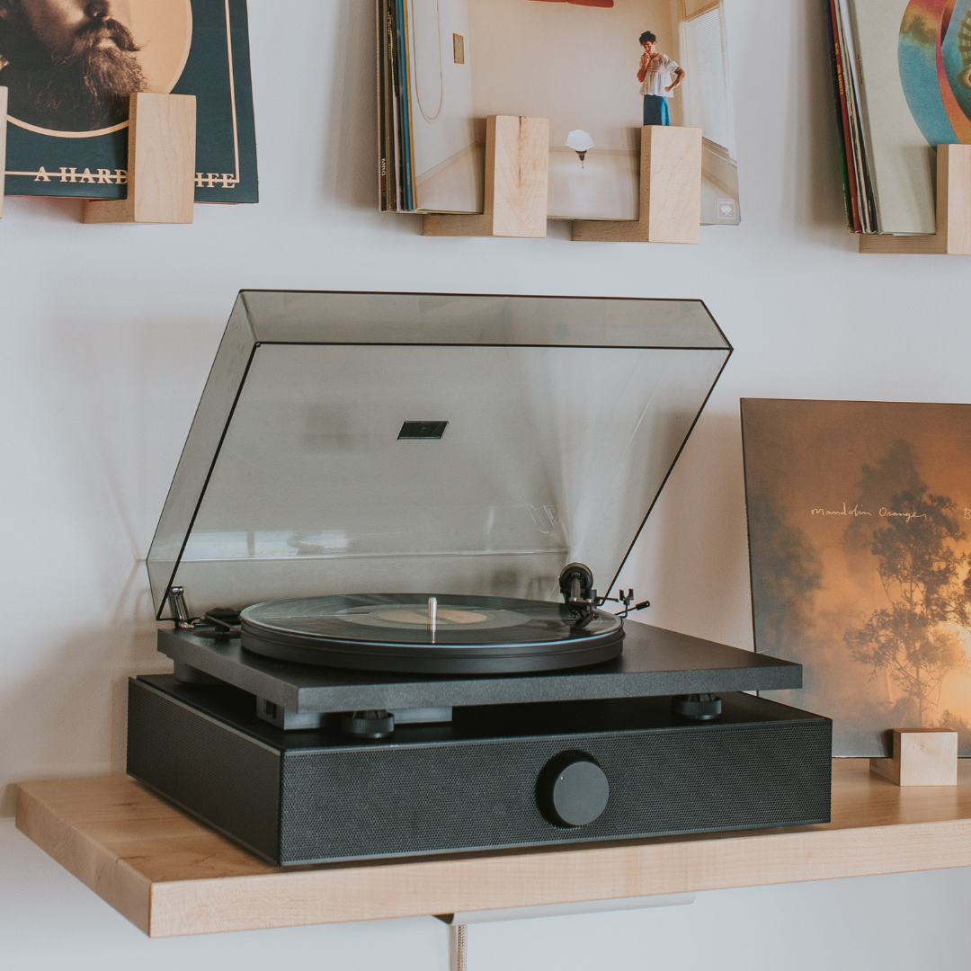 A U-Turn Orbit Special turntable in walnut sitting on top of wall mounted cube record shelves